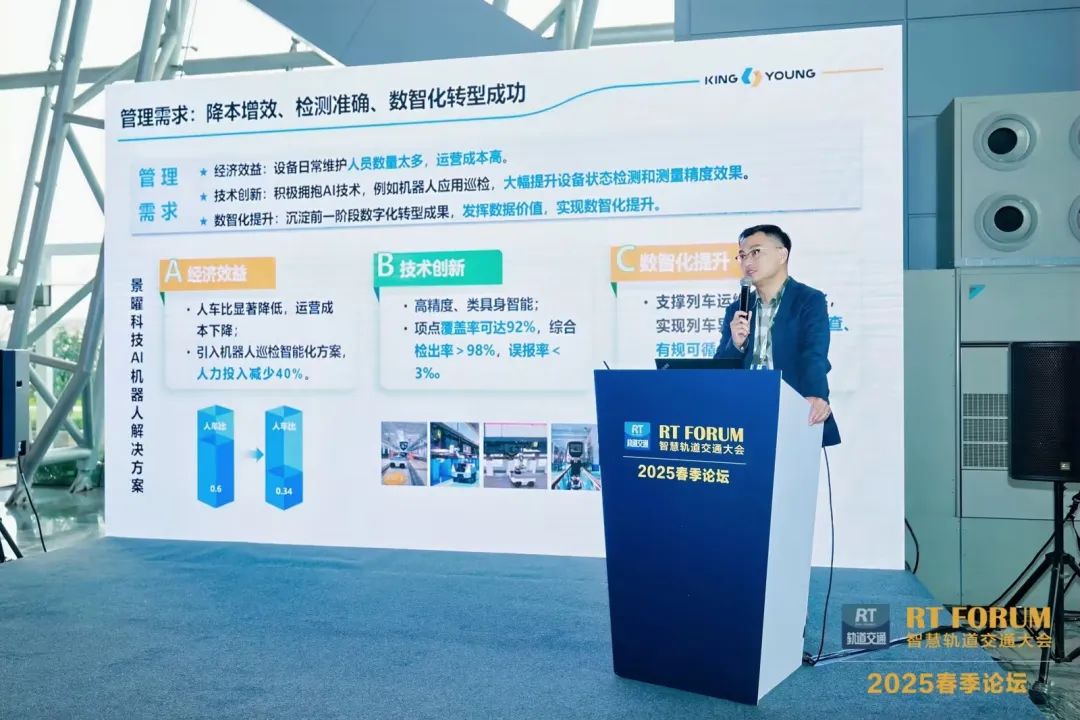 At the “Operation, Maintenance, and Modernization” forum, Zhao Sa, Deputy General Manager and Head of R&D at KING YOUNG Technology, delivered a keynote speech titled “AI Robots Empowering High-Quality Development in Rail Transit.” He proposed that through the technical approach of “data sensing-intelligent analysis-autonomous decision-making” for train intelligent operation and maintenance, AI robots can effectively enhance daily inspection efficiency and production data quality. He also highlighted the practical implementation plan for train intelligent inspection robots and future development trends of AI robots in the rail transit industry.