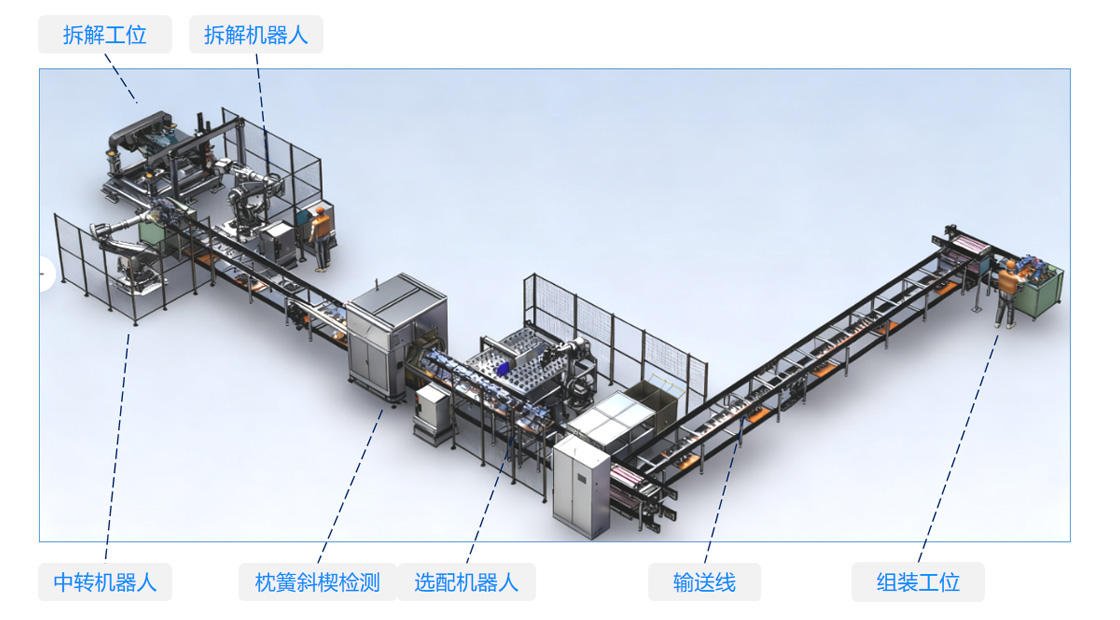 集枕簧斜楔的拆解、检测、分拣、选配功能为一体的自动化智能装备,应用3D视觉检测和工业机器人技术;
