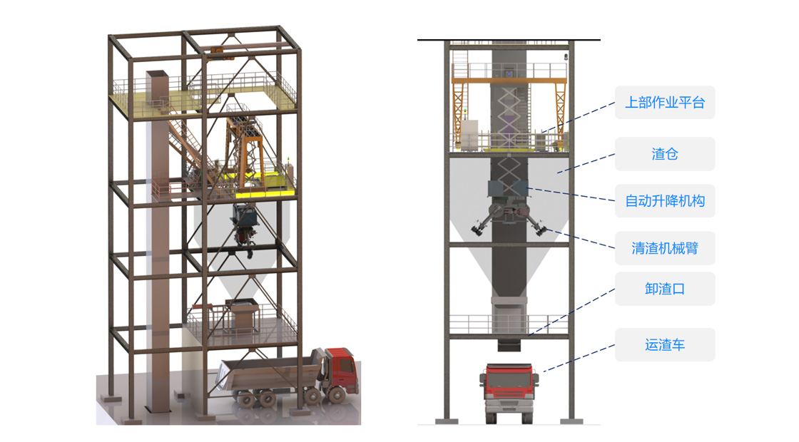 电厂的渣仓系统用于接收来自输送设备(如链斗输送机、斗式提升机)输送来的燃煤底渣,目前的渣仓日常内部清理作业中,主要是人工通过渣仓顶部的狭小出入口,身系安全绳进入渣仓内部进行清渣作业,日常清理作业难度大、危险系数高、存在较高人身安全风险。